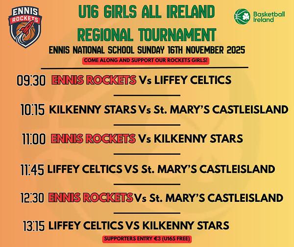 Rockets are delighted to host their first Basketball Ireland official National Tournament in Ennis National School on Sunday 16th November. Please come along to support the U16 girls, promises to be a great day of basketball.